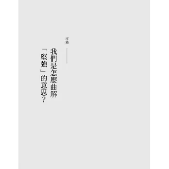 長久以來,我們以為的堅強是像推土機般蠻橫推倒一切障礙,誤以為壓抑情緒、接受極端考驗就能迎接成功。然而崛起的新興科學針對堅強克服挑戰,提出截然不同的定義,是時候停止以「變堅強」的名義,合理化荒謬的做法了。