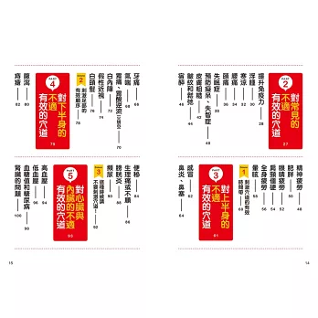 比起只刺激單一穴道,同時刺激複數的穴道會更加有效。在本書中,會針對我們的身體經常出現的45種不適,從穴道地圖之中選出最為有效的穴道組合,根據它們個別的穴道「位置」、「按壓順序」、「刺激法」進行一目了然、容易理解的解說。