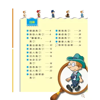 這是一套充滿童趣色彩的遊戲書,透過馬丁的各種角色,展開豐富多彩的遊戲畫面,再藉觀察、發現、比較、辨別,找出相同或不同的人或物。「視覺大發現」這種遊戲形式看似簡單,卻蘊涵豐富,功能多樣。孩子在發現、探尋的遊戲過程中,能體驗到遊戲的快樂和成就感,還能提升觀察力、專注力和判斷力,培養綜合的思維邏輯和積極的意志品質。