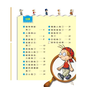 這是一套充滿童趣色彩的遊戲書,透過馬丁的各種角色,展開豐富多彩的遊戲畫面,再藉觀察、發現、比較、辨別,找出相同或不同的人或物。「視覺大發現」這種遊戲形式看似簡單,卻蘊涵豐富,功能多樣。孩子在發現、探尋的遊戲過程中,能體驗到遊戲的快樂和成就感,還能提升觀察力、專注力和判斷力,培養綜合的思維邏輯和積極的意志品質。
