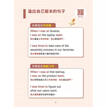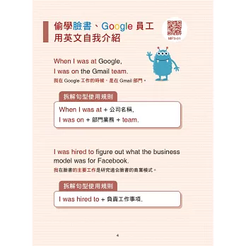 全書音檔可掃描QR Code或下載MP3。為加強學習效果,另提供豐富的全英文影片或文章,讀者只要掃描內文旁的QR Code,就可延伸學習,補充教材對應到詳細內文,全方位打造職場英語力!