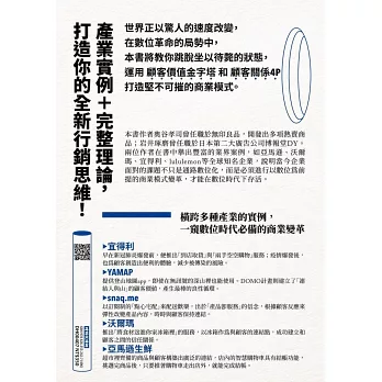 本書是以數位革命為前提,將著眼點放在數位革命所促成的行銷進化上。在顧客的「日常生活的數位化轉換」持續加速的此刻,行銷思維的根本已超出通路或促銷數位化的層次,逐漸轉換成以數位為前提。