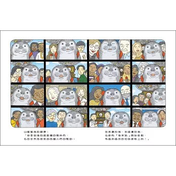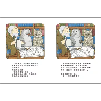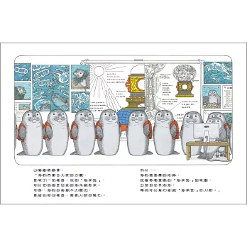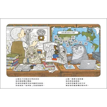 ◎山貓和海豹太可愛了!封面上,他們用堅定的眼神,邀請你我一起加入行動,很能勾起小孩的興趣和好奇心。圖畫裡有很多細節,譬如海豹調查團使用3C和網路視訊;而博學的山貓則是查閱書櫃裡的百科全書來協助翻譯,似乎也暗示傳統知識與現代科技的融合。這是一本和新聞時事有關,能引起兒童對環境保護和海洋生態興趣的可愛故事。――JA