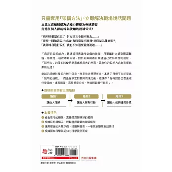 ◎目標不在於提高「說明的技能」,而是在鎖定對象與情境之後,能讓你「先確認自己想達成什麼目的,進而速查、套用特定公式,然後輕鬆進行說明」。