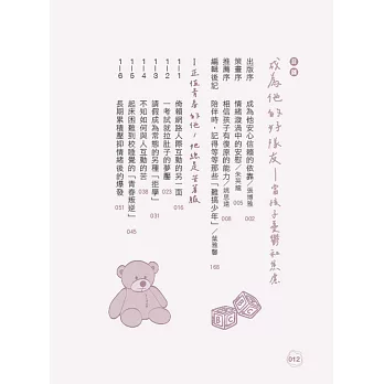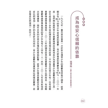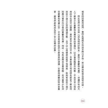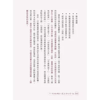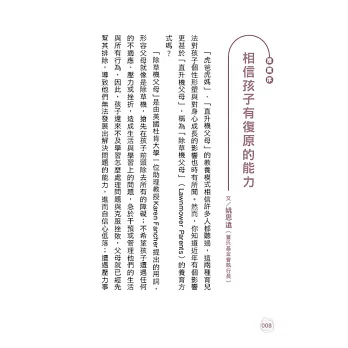 ◆復原力養成:專章介紹幫助孩子建立心理韌性的作法,提供父母相關培養情境及練習技巧的建議。