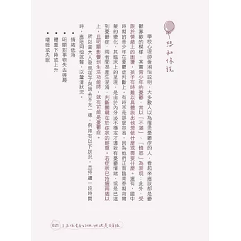 ◆真實故事:多篇真實案例,包括有人際交往困擾、無法起床上學、常到校睡覺、一考試就失常、經常覺得身體不舒服、依賴網路使用等情境。以第三人稱方式深刻詮釋有憂鬱或焦慮症狀青少年的罹病歷程與心情。