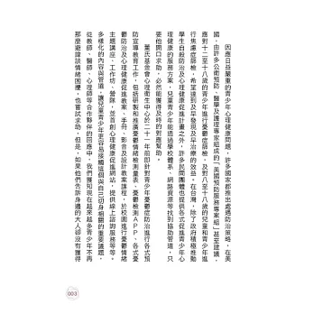 ◆陪伴力量:本書除了提供覺察辨識青少年憂鬱和焦慮症狀、引導其求助的相關作法外,另有多篇內容提醒陪伴照顧者注意自己的需求、照顧好自己與養成紓壓習慣。