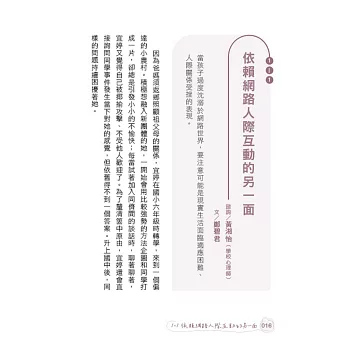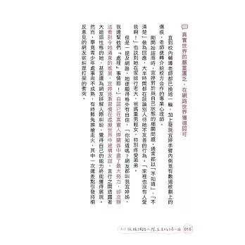 ◆實用建議:本書採訪包括精神科醫師、心理師、輔導教師等12位專家,每篇案例均有不同領域專家予以建議及回應,讀者可藉此了解不同角度的因應作法。