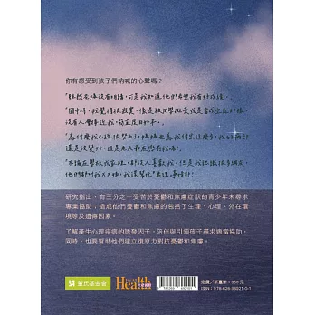 本書採訪多位輔導諮商與醫療專業人員,分享陪伴深陷憂鬱與焦慮情緒青少年的經驗,彙整國內外青少年心理健康問題的資訊,介紹幫助孩子建立心理韌性的作法。