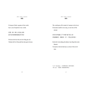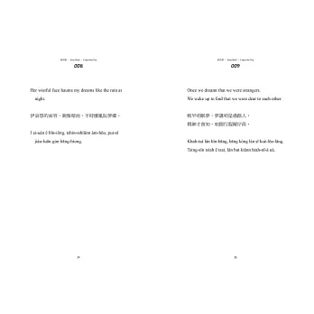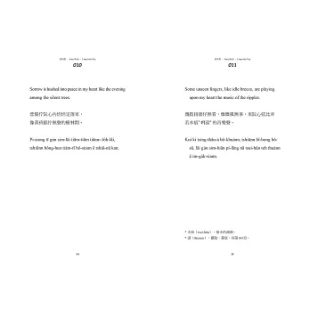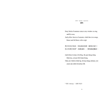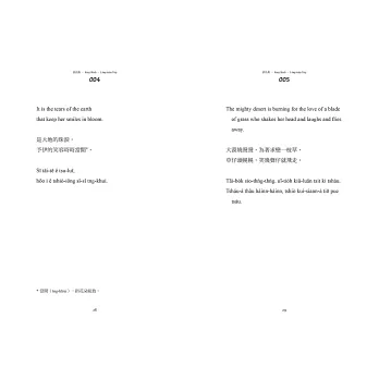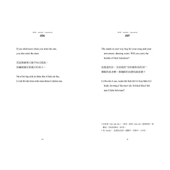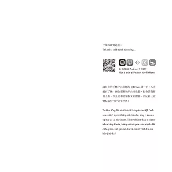 但我對這本書的期待不僅止於此。回到當初學習台語與創立Ohtaigi的初衷,我總貪心地想讓對台語文不甚了解、但願意接觸看看的讀者,也能有同樣好的閱讀體驗。所以我想過很多方法,最後決定為書中的生難字加上註解,並由我來朗誦、將整本書錄製成Podcast,讓不熟悉台語字的人也能用聽的來享受這本書。謝謝九歌出版社,在我提出這種超乎成本比例的想法時仍願意支持,甚至第一次與我面談就毫不猶豫地決定出版此書,讓我能在這麼地靈人傑的環境裡,向許多優秀的作者與編輯們學習。只要這本書裡的小巧思,能讓作為讀者的你對台語的美有任何一點新的領會,那就是最棒的事了!