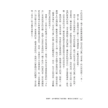 ◆我一直在研讀許多關於吸引力法則、思考的力量等心理勵志書籍……我必須說作者的這本書非常強大……書中提供了許多例子,並一步一步告訴讀者怎樣透過具體方法來逐步改善人生。……人生就是你投入什麼在其中,然後創造出來。你會因為努力而獲得成功。——亞馬遜讀者Trae