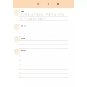 ◆本書作者所寫的內容非常務實,讓你相信,如果你很渴望的話,你可以做任何你想做的事。這本書主要是在講你要怎樣認識自己,並向你說明如何透過預想、計劃,以及最重要的,徹底實踐,來達成目標。如果你是個沒有信心的人,這本書真的可以幫助你專注於你想要完成的事情上。我真的跟所有人推薦這本書!很多自我發展的書告訴你該怎麼做,這本書也是,但它非常詳細告訴你該如何去做。你不會對這本書失望的!——亞馬遜讀者Deborah