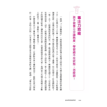 每篇文章直接以孩子在學習上常見的狀況為標題,從目錄就可直接檢索,根據自身需求閱讀。內文雙色印刷,重點清晰,隨手翻開就能看到建議做法。