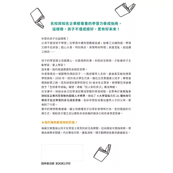 在本書中,她結合自己從學渣逆襲成學霸的學習經驗,並聚焦於名校及全球知名企業共同青睞的超級人才標準,總結了4大學習能力和21種有效引導孩子自主學習的多元成長思維,告訴你那些培養出優秀人才的父母,都做對了什麼。