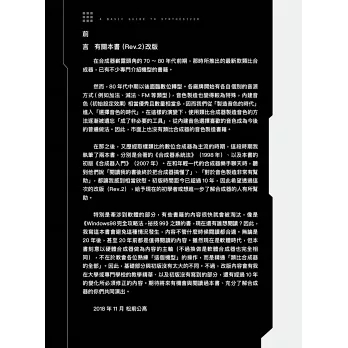 如今,電腦音樂‧音效創作都少不了合成器!只要具有充足的合成器基礎知識和操作概念,就算是內建的現成音源也能脫去平庸,成為你最驕傲的音色。本書以主流的減法合成方法,教你各種樂器和音效、例如救護車的嗶—波—嗶—波—聲、幽靈、UFO聲等經典音色的調製法,提供參數與操作過程、以及豐富的實例示範,跟著做一遍你就能具體了解、掌握竅門,領會音色創造的奧義。