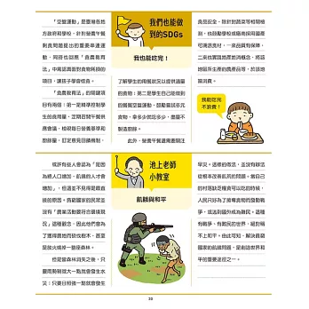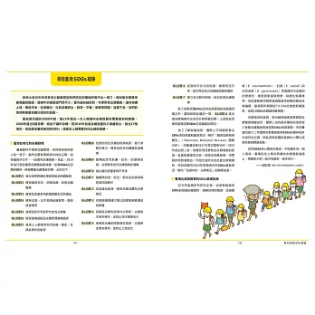 每章章末皆有日本監修池上彰先生提出的見解與解決之道,協助孩子更加熟悉此單元的精神。全書末亦有臺灣SDGs專家何昕家副教授專文撰述《尋找臺灣SDGs蹤跡》,可一覽臺灣目前SDGs的現況與進展。