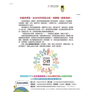 書封看似是給小學生的讀物,但書中的內容,無論哪個年紀,都很適合閱讀,透過可愛的插圖與漫畫,把SDGs的意義與精神都說明得很清楚,只要是地球人都應該來讀一讀哦!——陳人平(海湧工作室執行長)