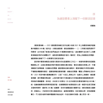 《最美書海報:2021滬港書業海報交流作品集》收錄2021年上海書業海報評選徵集中獲獎的246幅/組作品,分最佳創意獎、最佳視覺獎和一、二、三等獎及優秀獎等不同獎項,此外收錄了香港出版界選送的48幅書業海報作品。這些獲獎作品反映了上海書業海報設計製作的總體水平,這既是對獲獎設計者的一種肯定,更為上海推動全民閱讀、建設書香社會留下了一份真實而又鮮活的記錄。