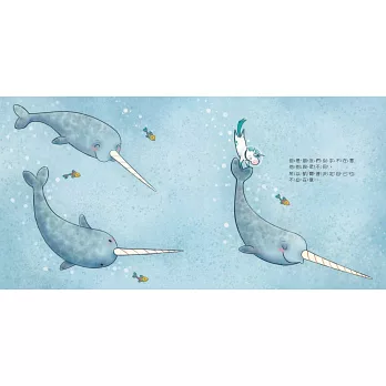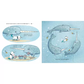 《我好像不是獨角鯨》也是台灣出版的第一本希瑪的作品,很開心看到聯經出版社將新銳插畫家的作品介紹給台灣的讀者。希瑪的插畫用色柔和、角色設計圓潤可愛,非常的討喜。獨角獸這種奇幻的神話生物,加上神祕的海洋動物獨角鯨,兩種長角動物都非常的討喜,讓這本書立刻吸引了讀者的注意力。但是兩種動物一個生在陸地上、一個活在海裡,要如何生活在一起呢?這樣的設定從一開始就預定了會產生衝突。希瑪不只很會畫畫,也很會寫故事,她為這個衝突點想出了最完美的解決方式,讓讀者在看到最後一頁的時候,會為這個童話般的故事,心滿意足的嘆一口氣。