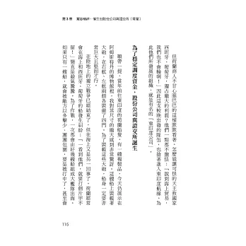 對此,本書精闢的指出,當時剛創建不久的新教徒國家荷蘭,其商人為了長期穩定的調度巨額資金、開展大航海事業,便發明這套劃時代的公司型態(其成果就是大家熟知的荷蘭東印度公司),連帶孕育了股票交易市場──證券交易所的誕生。不同於貸款,股份公司的股東出資不須限期償還,而是公司有獲利才須配息;萬一沒賺錢,說一句對不起、道歉就能了事,也不需要配發股息。