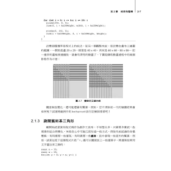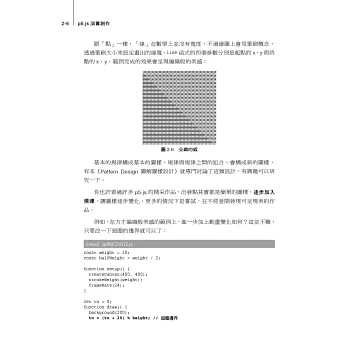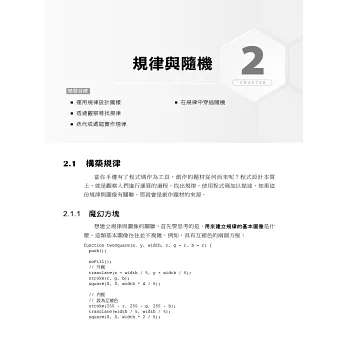 從三角函數、矩陣/向量、直角座標/極座標這些基礎數學出發,再透過蚊香、拼接磚塊、刺繡、地毯這類貼近日常生活範例,帶您進入螺線、曲線、碎形、雜訊、迷宮、計算幾何、力學、視覺化等進階議題,再運用程式設計的方式創作出整個世界。