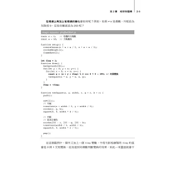 - 介紹 p5.js 的事件處理機制,包括事件堆疊的運作、動畫控制、滑鼠控制等議題。