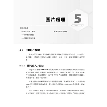 - 介紹 p5.js 的圖片處理方式,包括 2D/3D 呈現、視角變化、畫布/像素/濾鏡/遮罩等概念。
