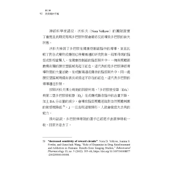 ►成癮就像是一個光譜,在重度成癮和絕對無癮的兩端之間,每個人都可以找到自己的位置。這本書讓我們知道,只要依循著適當的步驟、付出足夠的努力,就有可能調整自己在成癮光譜上的位置,而不是永遠被多巴胺牽著鼻子走。