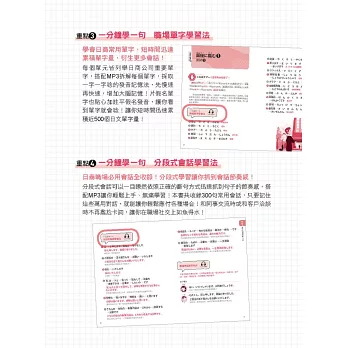 本書專門量身設計角色人物,用故事性情境帶入日商公司會遇到的各種場合,職場單字與會話透過分段式學習法,再搭配MP3輔助,在不知不覺中掌握與同事和客戶的應對話術與技巧。