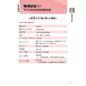 疫情期間冒出許多新用語,日文也不例外,要怎麼在日商公司裡與同事客戶討論說明?別擔心!本書完整收錄時下最夯的疫情用語,讓你在日商職場上無往不利,也不用擔心對方提出的時候聽不懂、看不懂,只能擺出尷尬又不失禮儀的笑。