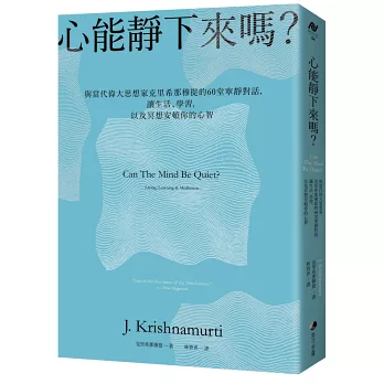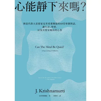 克里希那穆提在書中分別針對生活、學習和冥想領域,賦予讀者盛載著聖哲思想精髓且清晰明瞭的答案: