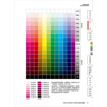 此外,本書最超值的部分,就是還替讀者準備了多達 112 頁共 467 色的常用色票,包含 JIS 標準慣用色 269 種 + 常見的日本傳統色色票,所有色票都會附上 CMYK 值以便調配,還會附上該色系的混色樣本和演色表等實用資料。做設計的時候,要是手邊有這本書可以查,一定會很方便吧!