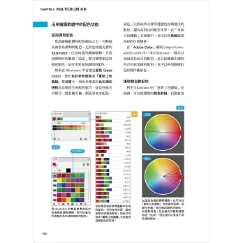 配色方面,作者重視實作教學,她會以設計人熟悉的 Photoshop 和 Illustrator 為例,說明如何在軟體中活用色相環或色輪,配出兩色、三色、四色、多色的配色,只要了解原理,不用死背範本就能自己動手選出符合需求的配色。