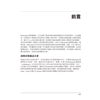 Kubernetes四位專家將帶領讀者瞭解如何利用Kubernetes部署分散式應用程式。軟體開發者、工程師、架構師可以藉由本書學到如何使用工具及API來自動化具有可擴充性的分散式線上服務、機器學習應用程式,甚至是使用Reapberry Pi建立叢集。