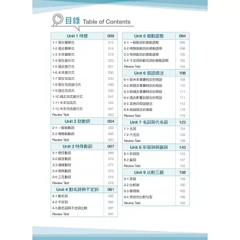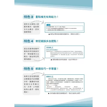 ★全面學習:每單元均有學習提示、文法涵義、文法圖示、文法解析、常犯錯誤與解題技巧,給予全方位的文法學習。