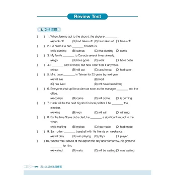由於本書的內容編排涵括國中到高中,在教學時,教師可依班上學生程度與年級來調配比例,或是選擇單元來使用。可先照每單元開頭的文法重點與文法圖示來說明文法重點、句型結構,再進入細節的講解,可配合隨堂練習隨時檢視。每單元教完後,可進一步配合Review Test的練習題,加強文法與不同領域概念的結合,掌握考題趨勢。而自學的讀者也可透過此書的編排方式,循序漸進學習文法,以應付學校考試、英語檢定或入學考試。