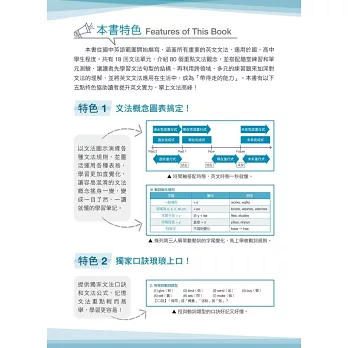 有鑑於此,在我大二踏上補教業,到現在已有十多年的教書經驗,讓我深知學生的文法罩門與常見錯誤,也讓我了解到一本好的文法書,重要的不只是文法的內容,更是文法的整合與解題技巧的教導,於是編寫了這本《高中英語文法與練習》。這本書並非一蹴即成,是作者由國小、國中、高中職一路教書的經驗編寫而成,加上出版前給國、高中學生的試用成果。相較於市面上的文法書,本書更強調文法的圖表與整合性,讓讀者能更有效學習。書中同時也加上學生們常見的文法錯誤、題目解題技巧以及豐富多元的練習題。因此,不論是自學或作為上課教材,都會是一本合適的用書。本書有以下十大特點: