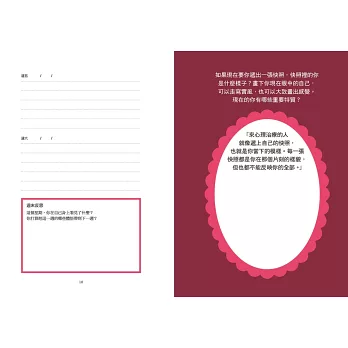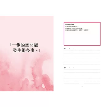 這本日誌反映的是我的諮商工作——陪伴你與自己對話。在架構上,它和每週諮商的節奏相符:每週都以一個課題開始,鼓勵你像接受諮商一樣,以新的方式思索自己的相關經驗、敘事、人際關係。接下來六天就像兩次諮商之間的空檔,讓你反思自己對這個課題一開始的反應,進而深化、擴大你的回應方式,同時見證自身想法的轉變。我一直很欣賞心理治療的這個面向:晤談結束後先花幾天消化談的東西,沉浸在自己的想法裡,設法擺脫無效的舊模式,並在現實生活中嘗試新的方式。下週回到諮商室時回顧自己的進步,在對話中更進一步,逐漸增加覺察,讓情緒重獲自由。