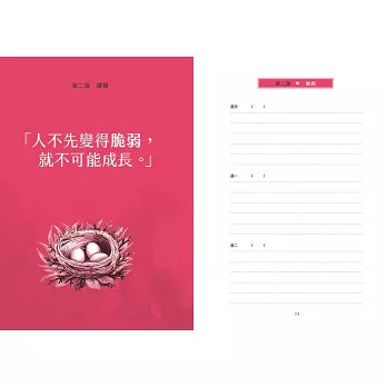「你在這本日誌寫下的每一個字、每一句話,都是關鍵的一步,都是走向意義深遠的改變之路的腳印。」這本日誌附有簡潔優美又富含隱喻的插圖、著色頁、溫和小檢查、進步評估,以期能為你提供獨特的經驗,幫助你溫柔探索內在深處,聽清自己的聲音。這是改變人生必備的有力地圖,它將協助你以前所未有的方式,思索愛與渴求、意義與死亡、愧疚與救贖、恐懼與勇氣,以及希望與改變。