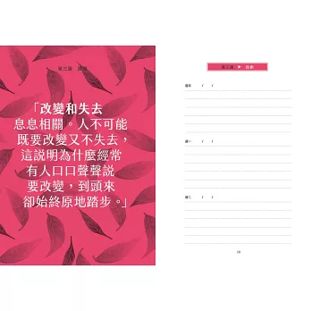 「改變和失去息息相關。人不可能既要改變又不失去,這說明為什麼經常有人口口聲聲說要改變,到頭來卻始終原地踏步。」