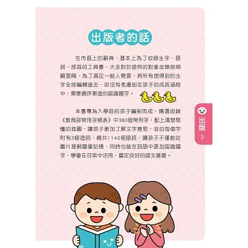 收錄《教育部常用字頻表》中380個常用國字,專為低幼齡孩童打造,從小奠定良好的語言基礎。