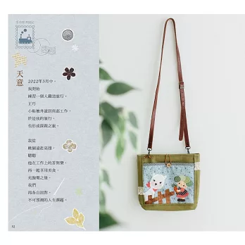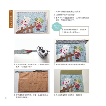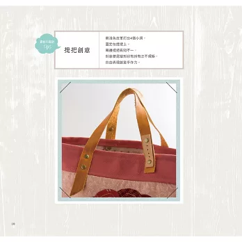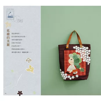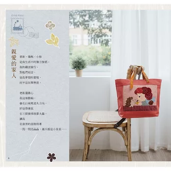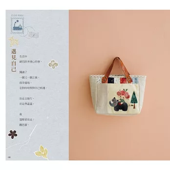 這本書的作品,保有原本的拼布基礎底子,但我也不再執著只以傳統與工法製作作品,這一次,我只想照著心裡的藍圖,走一回!拾回對於手作的熱血之心,試試能否再沸騰自己的創作慾!