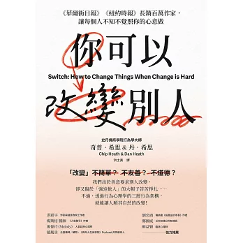 「無論你是經理、家長,還是公民領袖,對你來說,改變他人可能都是件棘手的事,希思兄弟在本書中對人類行為做了調查,並找出有效的方法……即使改變不容易,但付出的努力往往很值得。」──時代雜誌