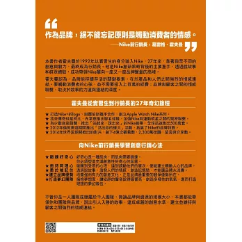 「霍夫曼在Nike的漫長職涯中,推行了設計、簡約和創造性協作的藝術,用以連結Nike的數百萬名忠實消費者……這種鼓舞人心的方法在本書中栩栩如生,是霍夫曼的遺產,也讓Nike在全球化競爭中獲得了巨大的優勢。」──鮑伯.葛林伯格(Bob Greenberg),R/GA創辦人暨執行主席