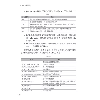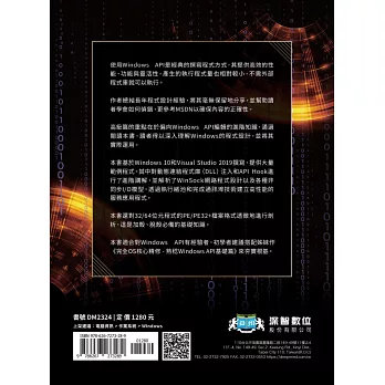 本書基於Windows 10 和Visual Studio 2019(VS 2019)撰寫,提供了大量的範例程式。本書內容包括記憶體管理、多執行緒及執行緒間同步、處理程序間通訊、檔案操作、剪貼簿、動態連結程式庫、登錄檔、異常(或稱例外)處理、WinSock 網路程式設計、系統服務和使用者帳戶控制等,其中對動態連結程式庫(DLL)注入和API Hook 進行了深入講解,並解析了WinSock 網路程式設計以及各種非同步I/O 模型,透過執行緒池和完成通訊埠技術實作了一個高性能的服務程式。另外,本書還對32 位元/64 位元程式的PE/PE32+ 檔案格式進行了深入剖析,這是加殼、脫殼必備的基礎知識。