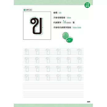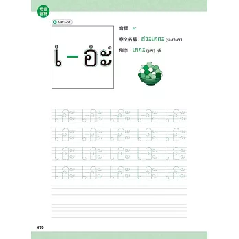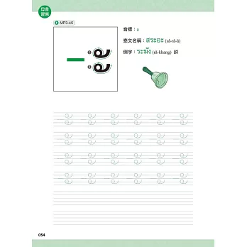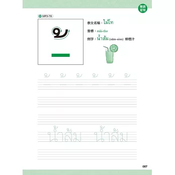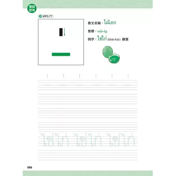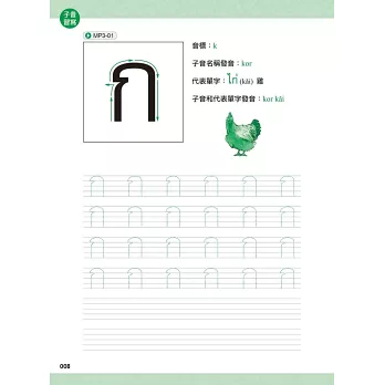 本習字帖除了讓你用手、用眼,學習泰文字母外,也特別收錄代表單字、例字及MP3音檔!