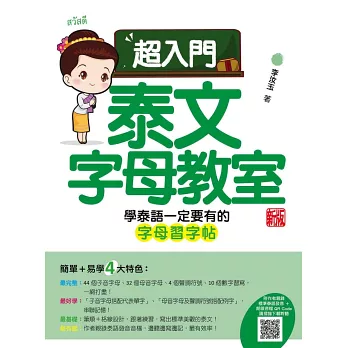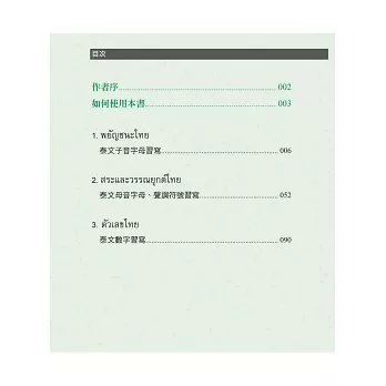 為了解決學習者資料不完全、花太多心力在找資料上的困擾,本書完整收錄了泰文的拼音元素:44個子音字母+32個母音字母+4個聲調符號+10個泰文數字,共計90個習寫練習!