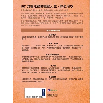 這是一本50歲左右中年人如何進入優質生活的心路歷程。特別的是,作者是一位50歲的心臟外科女醫師,娓娓道來她如何走到如今這個境界的,成就所謂的「機智生活」的。