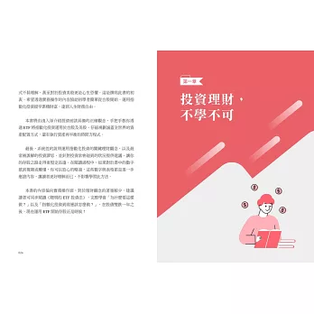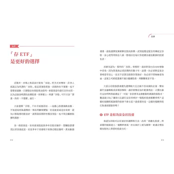 所以存ETF投資理財就是我們這本書的主要概念,我的上一本書《聰明的ETF投資法》裡詳細介紹了許多生活理財與投資基礎觀念,也介紹了指數化投資的概念與資產配置方式。但是我發現有許多新手投資人對於何謂指數化投資還是很疑惑,最多人來詢問的就是是否可藉由存金融股與高股息ETF來領股息,讓日後經濟無虞。所以我想透過這本書,更深入的講解指數化投資的運作執行方式,我介紹推薦了好幾檔指數型ETF,即可達到傳統存股族期望的需求,相較於存金融股,存股其實可以更簡單也更有效率,而且整體資產成長還能更快速,風險還更低,在執行上也更簡單、省時。