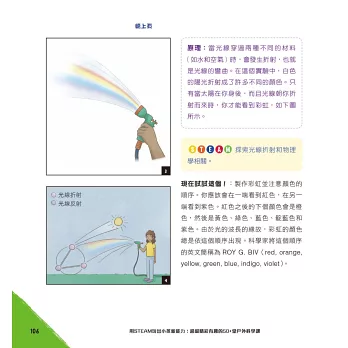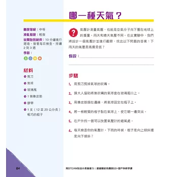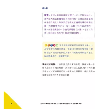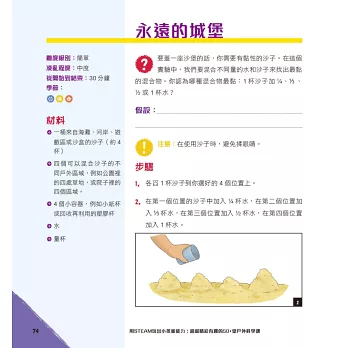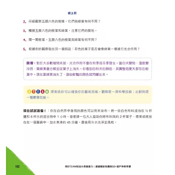 這些活動大部分是使用家中已具有的物品、生活周遭與大自然可見之事物或是可購買之用品,且步驟較為簡單化!本書的每個活動都採用科學方法,這也是STEAM探索和解開謎團的方法。當提出問題的那一刻,科學方法就開始了。接下來,會形成一個假設,或者針對可能找到的答案進行有依據的猜測。然後動手做來檢驗假設,觀察會發生什麼事。